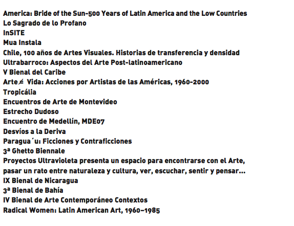 Curaduría de Latinoamérica es el resultado de varios años de estudio y análisis de las principales muestras de arte contemporáneo a través de un ensayo introductorio y de un diálogo con las responsables de cada exposición, exhibiciones que, aunque se han dedicado al arte latinoamericano, han marcado el compás a nivel internacional, siendo, en muchos casos, más creativas, más profundas, más inspiradoras o más precisas que las más mediáticas producciones ideadas por y para el centro hegemónico.